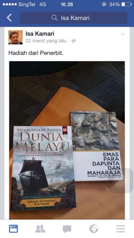 Bertuahnya tadi,tokoh penulis Singapura ini telah berpeluang menatap buku-buku yang melibatkan saya,Melayu Pribumi Asia Tenggara dan Emas Para Dapunta & Maharaja.Buku pertama adalah koloborasi saya dengan dua lagi penulis manakala buku kedua adalah buku tulisan saya sepenuhnya.